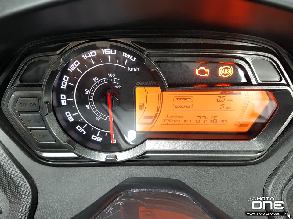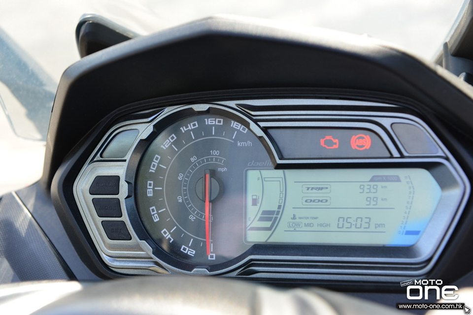 儀錶板除了顯示一般的行車資訊如油量和時速外,亦會顯示行車里數及時間,更有趣的是可自行調校屏幕顏色。座位下的儲物箱能放下一頂頭盔。軚盤右下方的小儲物箱亦有USB端口供司機使用。