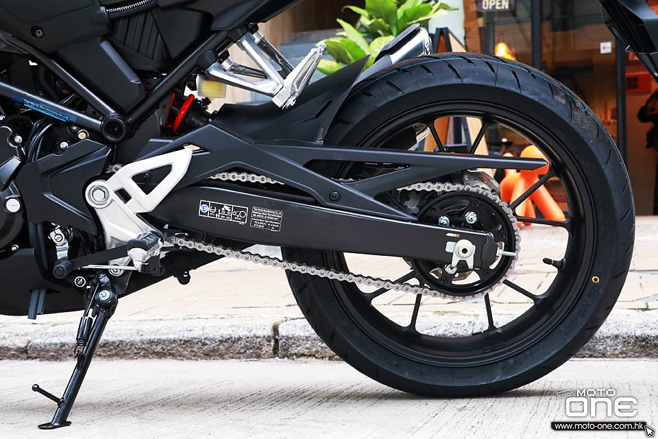 CB300R採用編織型鋼管車架,但配備看起來更高級的41mm倒立前叉,但不設調校,尾是HONDA PRO-LINK多連桿單筒尾避震,前及後均是17吋輪框。而另一項較高級裝備是ABS採用IMU(慣性測量系統)收集數據,換句話說ABS甚至可以根據車身傾則角度作出介入,為騎士提供更精準防鎖死煞車效能。