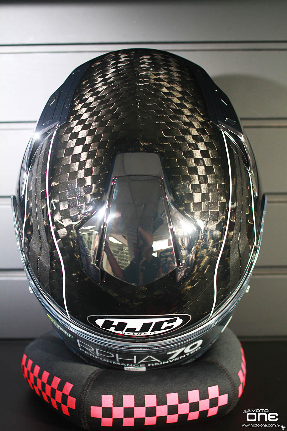 在頭盔櫃上雖然顯得非常低調,調猶如普通全黑頭盔一樣,但在光亮的地方有截然不同的反射效果,正是此HJC R-PHA70 CARBON頭盔有趣的一面。