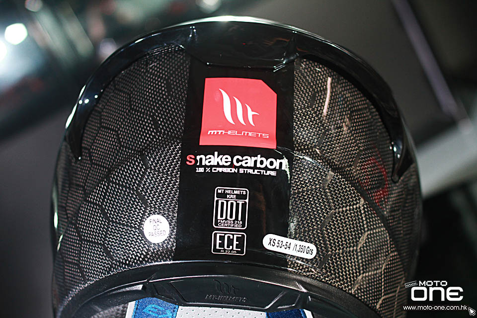 MT KRE SNAKE CARBON是MT helmets 頭盔中最高級的比賽型號,外殼採用優質100%蛇紋(六角型)碳纖維製造,紋路美觀獨特,仍保持強硬度同時提供輕量化,重量僅為1,350g,符合美國DOT及歐盟CE/ONU 22.05.P 安全規格。還有是 Moto3 19號阿根廷藉Gabriel Rodrigo及22號日本藉Kazuki Masaki 兩名車手均使用MT KRE SNAKE CARBON比賽,保護性無容置疑。