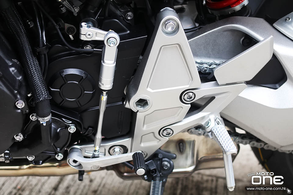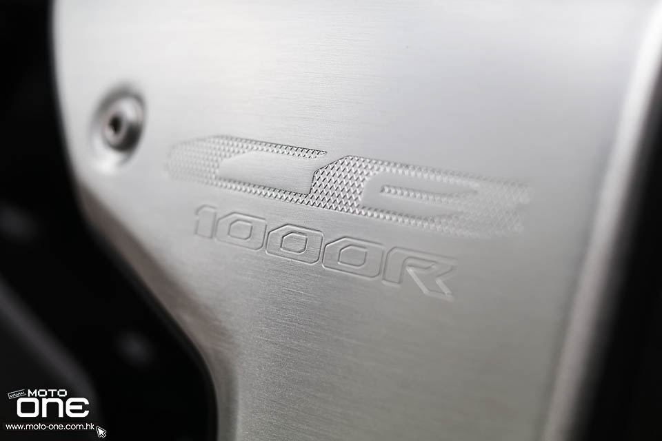 至於今次的CB1000R PLUS版,大玩TWO-TONE配色設計,首先加入了鋁片的小風擋、鋁合金弣CB1000R圖案的水箱保護網、新加有的鋁片黑殼的單座椅冚(附有原裝後座椅)及頭尾沙板亦同樣加入鋁片等等,較CB1000R 標準版本,添加更多銀黑TWO-TONE對比的元素,外觀更俱美態。