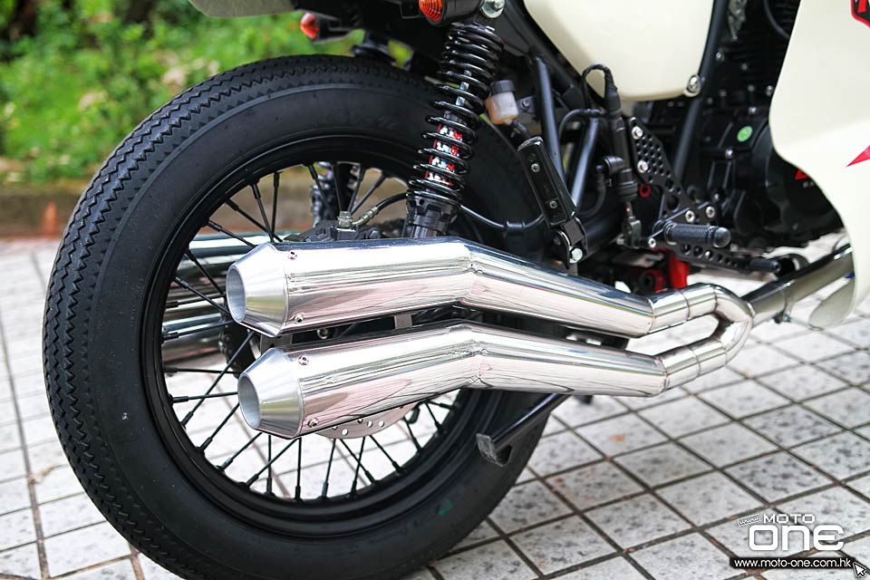 那個泰國特製的包圍,是純原色抵港的,車主想擁有自己喜愛的拉花,這工序需交由本地專業的噴油技師負責,還有今次幪面超人旋風號改的油缸,亦是代理拆卸後,交由噴油技師,達至包圍與油缸一致配色拉花的效果。另外,其實這改裝排氣喉是單邊輸出的,另一邉是作裝飾用途,相信大家都明白,一部197.4c.c油冷單缸引擎無需一出四排氣喉這個設定,純為配合幪面超人旋風號外觀造型而設的。