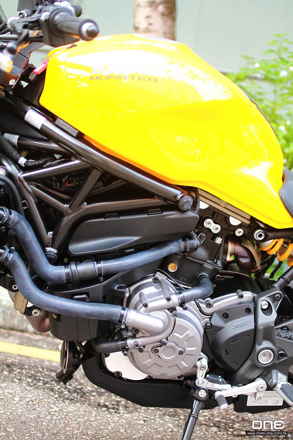 回顧2014年第一代MONSTER 821面世情況,當時廠方表示821的外型源自高階版1200,引擎則移植自城市爬雞HYPERSTRADA的821cc水冷四衝程 L2 Testastretta 11° 8氣門引擎。車廠為加強MONSTER 821的易駕度及提升騎士的安全,因此加入DUCATI SAFETY PACK電子裝備,此系統包括8段式循跡系統、3段調校的ABS及3個馬力模式供騎士選用(URBAN市區、TOURING巡航、SPORT運動)。