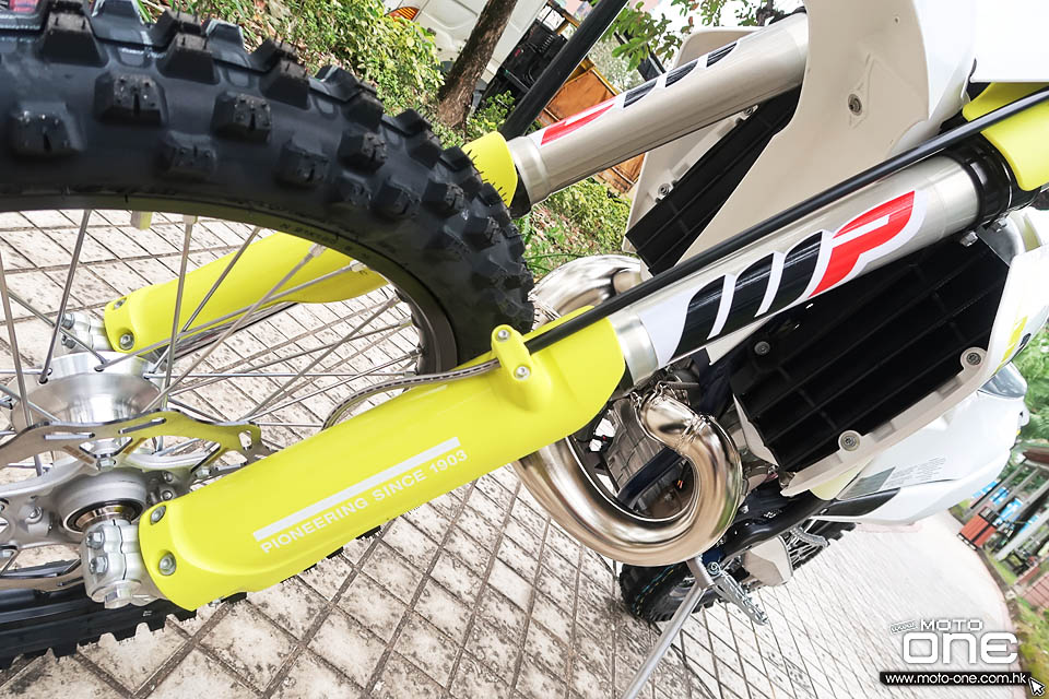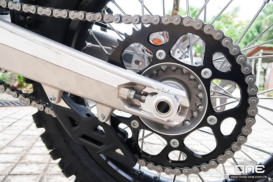 48mm WP AER倒立前叉設全方位預調,彈簧預壓無需工具,十分方便,右方頭叉頂調節下沈油壓反應,右方掌管回彈阻力,CNC電腦切割鋁合金上下眼鏡加強對車子的操控性。設氮氣輔助的WP單筒油壓彈簧尾避震理所當然地設全方位預調,並配備多連桿鋁合金尾擔。我們時常強調那多連桿設計,主要作用是分擔尾避震的工作壓力,同時減輕車手的體力消耗。在回彈的瞬間,視乎各車手的習慣,部份人會欣賞直接的回彈反應的,就節省體力一項,多連桿設計略佔優勢。那CNC電腦切割成形的頭尾轆盒(輪框中心軸)除了造工精美,輕量化外,更加強越野車最常提及的一項 --- 操控性,此項激烈運動的車子主要針對就是首要這項......然後是馬力......等等互相配合。 總結
