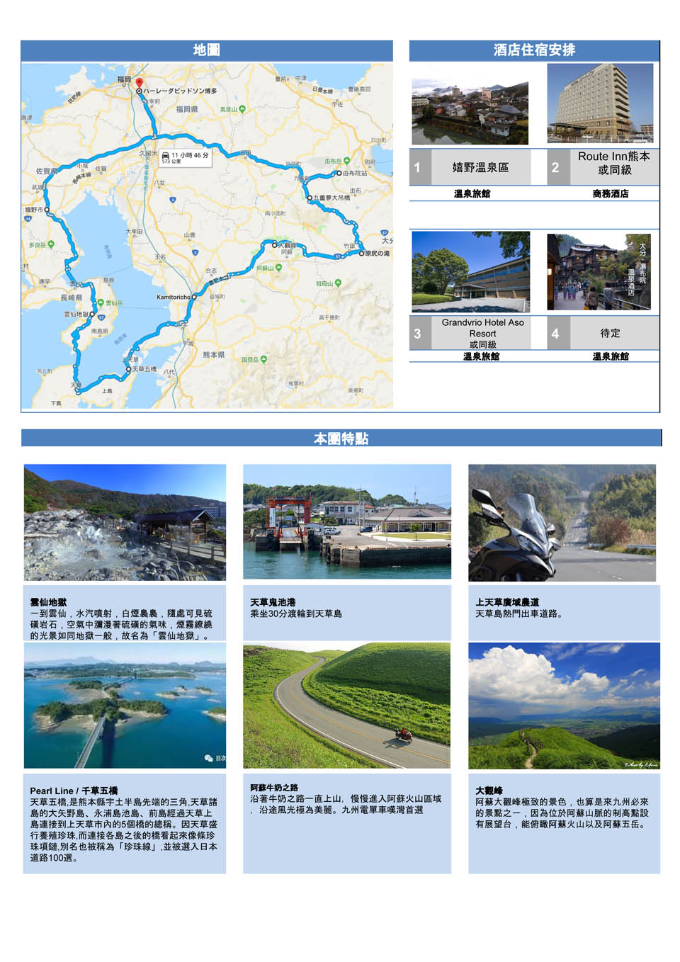 〔九州山路自駕遊-4月10日至4月14日〕日本自駕遊2019第一團,接受報名 這一團將會帶大家來到對日本騎士來說最有魅力的九州,體驗曲折的山路,以及比關東更加宏大的自然景色!景點包括日本十大著名出車道路天草珍珠路,Milk Road,阿蘇山Skyline,以著名景點天草五橋,並會途經熊本、福岡等九州多座名城。全團會入住多座溫泉溫店,為你一解旅途上的疲勞!同時亦會到訪日本的電單車用品店,讓你選購各種不同的騎士用品滿載而歸!