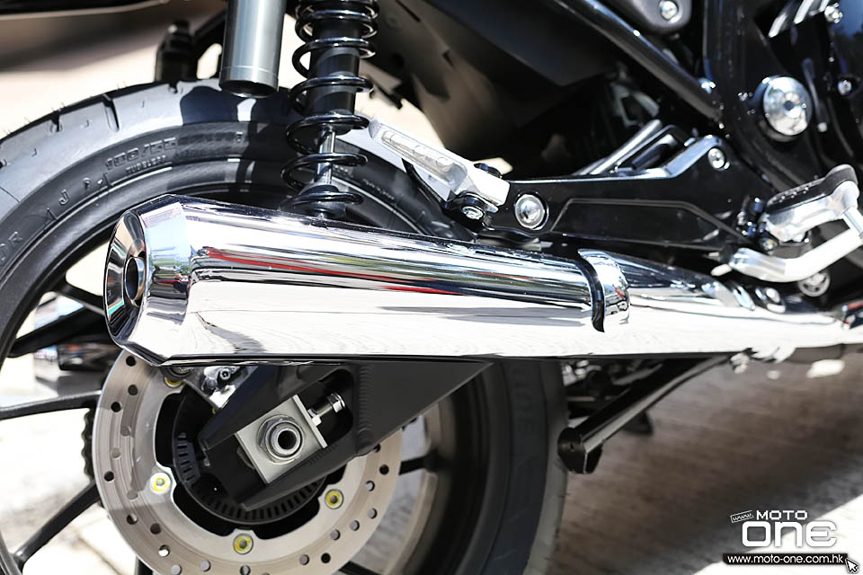 2019 HONDA CB1100 RS近日抵達香港,裝備上維持不變,但在外觀上採用「黑」色的主調,由上一款(2017款)的金色前叉、前後掣動卡鉗、雙筒尾避震的彈弓等等,2019年款均全數改用黑色,配合今次黑色車身配色的主題。在油缸上特別加入閃粉底黑色及HONDA立體啞黑色,還有引擎的盤頂亮黑、中層啞黑塗層及引擎殼亮黑的多段配色,將黑色有層次的運用。最後,全梳排氣喉、引擎盤頭的兩個圓位、睹後鏡等採用電鍍銀的效果,正好與黑色形造強烈的對比,同時也有閃亮的效果。