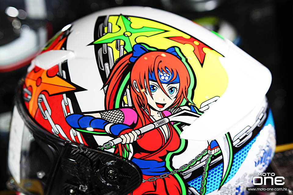 今次,SHOEI推出了 Z-7 STIMULI 色彩繽紛女忍者全面頭盔,左右兩邊分別是兩名可人的女忍者,配色鮮明搶眼,在後方有著"自來也"、忍者服飾的蛤蟆、巨浪及富士山,和風處處,當中的"自來也"與蛤蟆,不禁聯想了上述的"火影忍者"的故事。