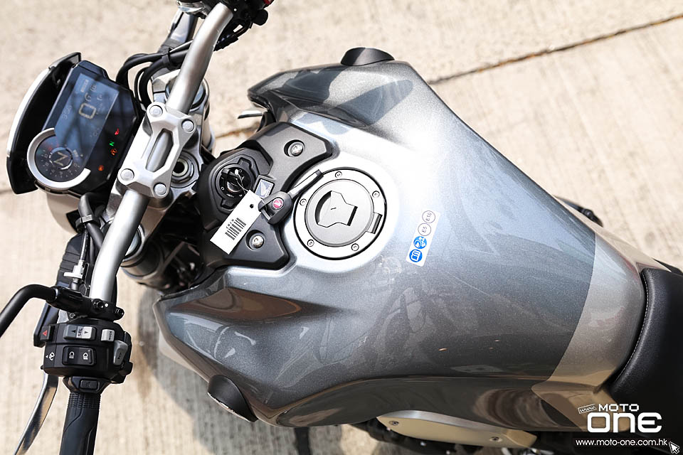 至於今次的CB1000R PLUS版,大玩TWO-TONE配色設計,首先加入了鋁片的小風擋、鋁合金弣CB1000R圖案的水箱保護網、新加有的鋁片銀殼的單座椅冚(附有原裝後座椅)及頭尾沙板亦同樣加入鋁片等等,較CB1000R 標準版本,添加更多銀黑TWO-TONE對比的元素,外觀更俱美態。