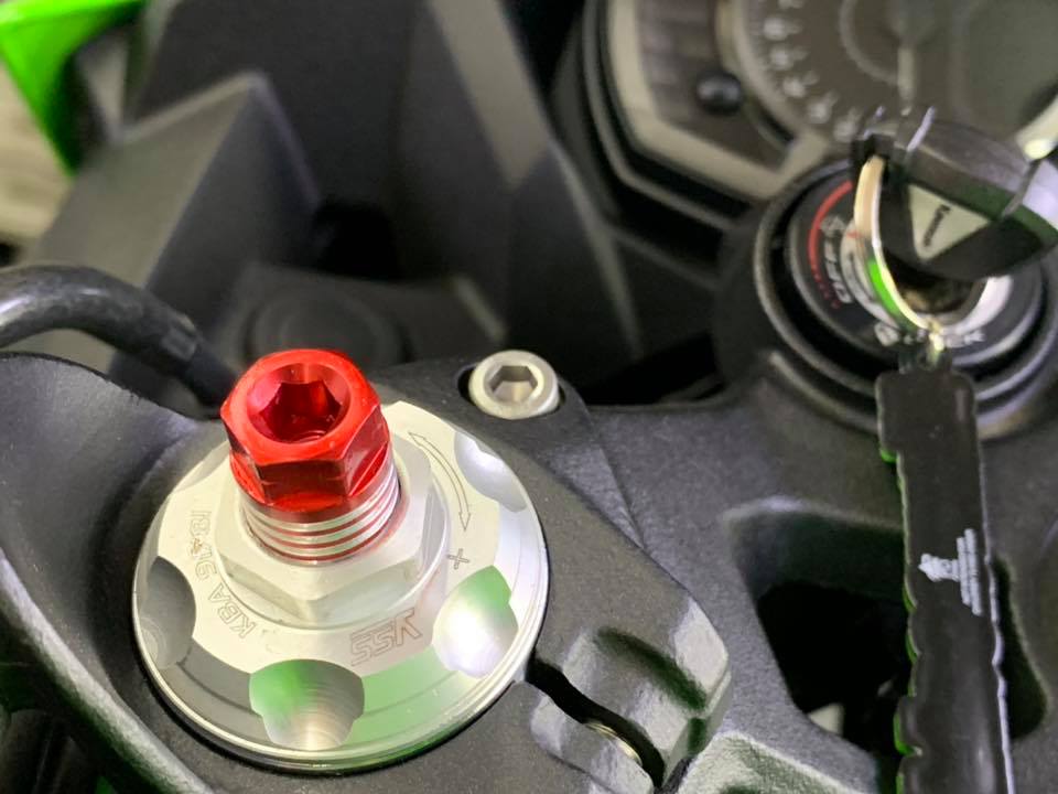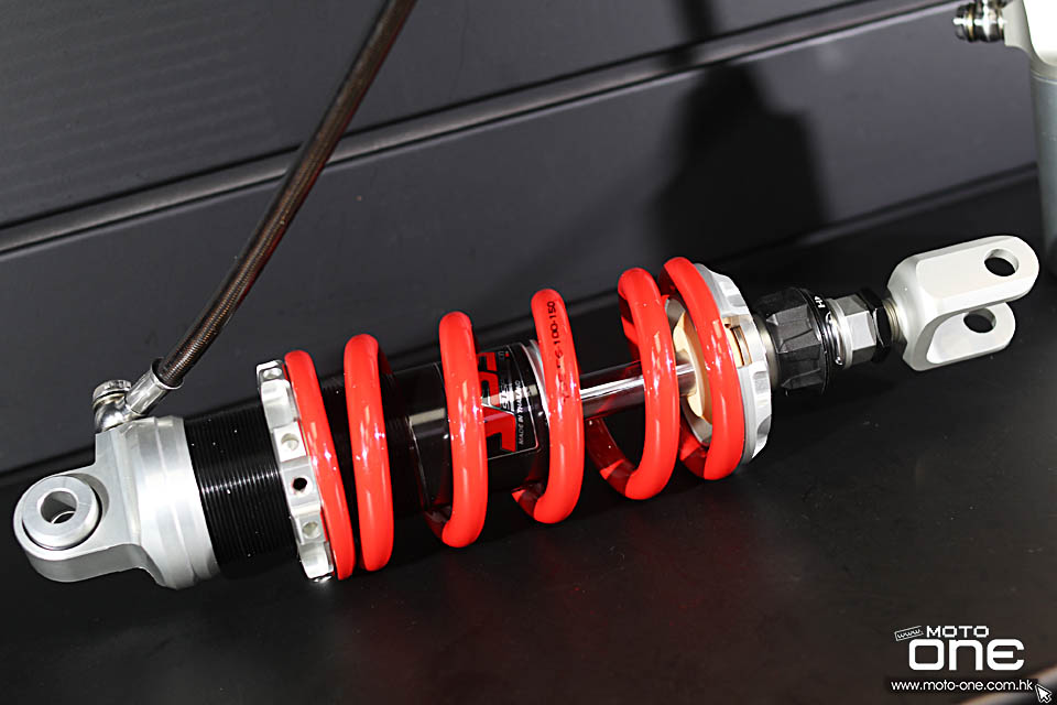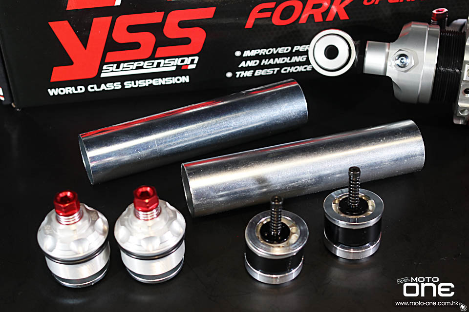 YSS前叉組件備有彈簧預載的校調(約10mm多的差距),騎士可自行於前叉頂部校調,自己合適的設定。另外,此套裝提供「嘩佬」組件,好處是可有效控制前叉油的流量與阻力,無論高低速得到相應的調節,提供更佳的操控性。