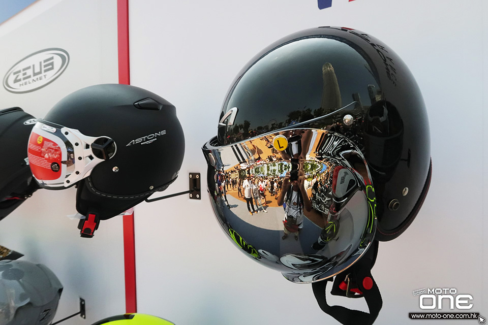 當中,為了是次車展特別新返了RACE R-PRO 99 KEEP FIGHTING拉花賽車頭盔、ZEUS ZS-3030 大熱水泥灰色新款揭面頭盔、ASTONE蠍子拉花全面頭盔等等,全場共有45款不同款式的拉花頭盔,除了給與參觀者欣賞,也可當場試戴,親身感受。