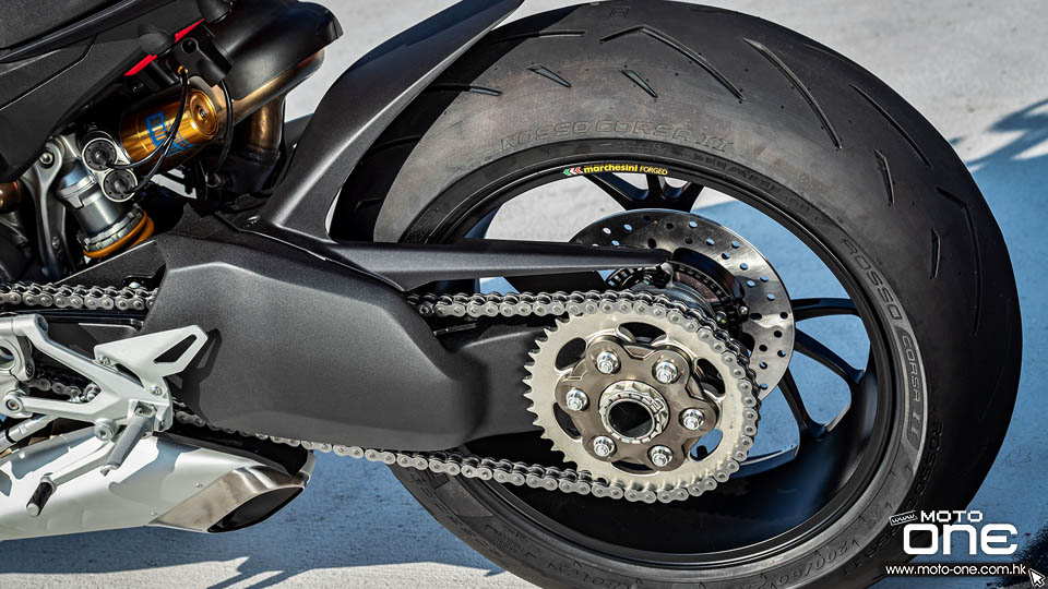 至於S版採用更高級裝備,吸震系統採用直徑43mm Ohlins NIX30電子前叉,金色外管反映S版身份,同樣由電子控制的尾避震是Ohlins TTX36,這對組合由Ohlins Smart EC 2.0系統控制。前、後輪框換上更高級、更輕量化的Marchesini鍛造輪框,還有採用Ohlins釘把,車輛的乾重及裝備重量只有178kg及199kg,較標準版輕。