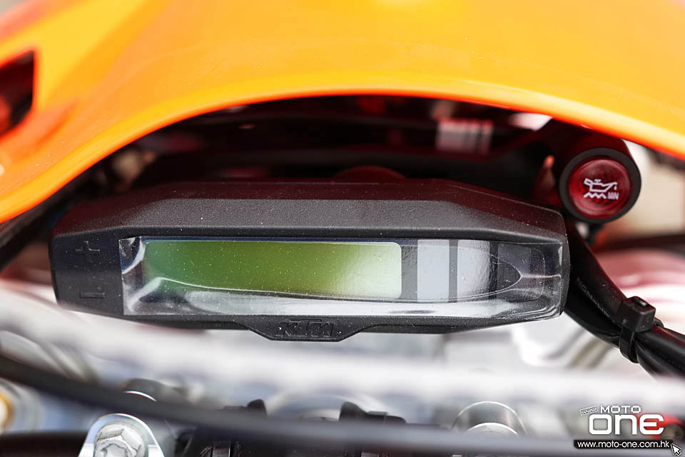 事實上,平均1:80的氣油/2T混合比例並非固定數字,而KTM 150/250/300 EXC TPI的可變幅度由1:60至1:100,行車電腦可根據引擎轉數等數據不斷自行調節,為引擎提供最佳潤滑及燃燒效果,而氣油燃燒後比舊款化油器版KTM 250 EXC大減50%白煙。萬一2T油不足,儀錶便會亮起警示燈,提醒騎士倒入足夠的2T。要是騎士置之不理,或誤解單以氣油可潤滑引擎,那就可能發生引擎爆偈的情況。