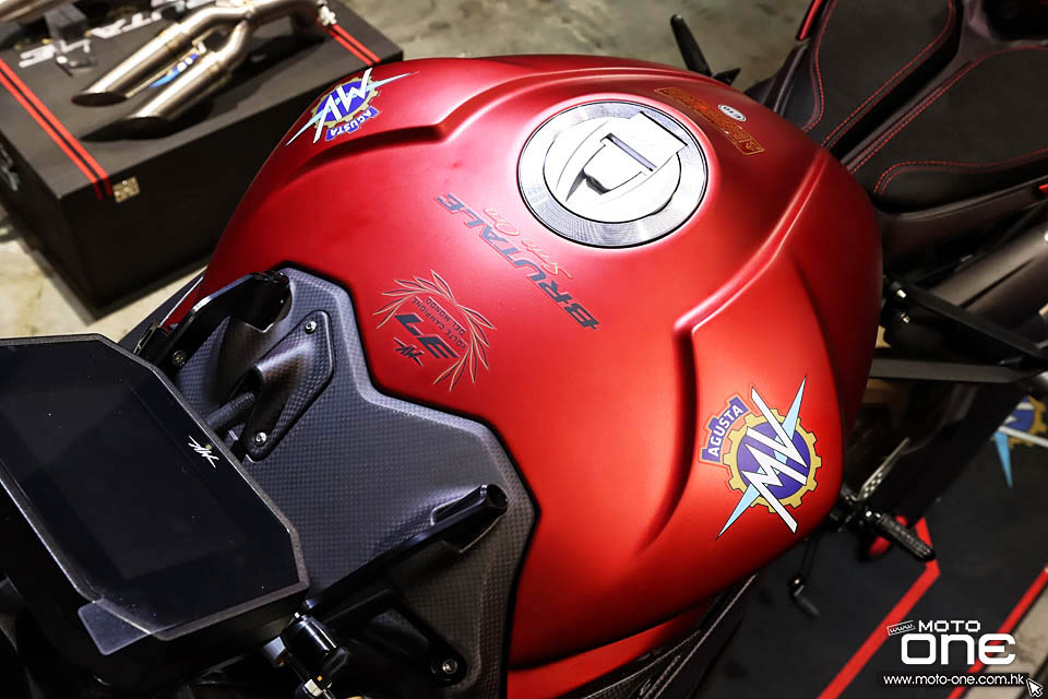 廠方專門為新車配置一套引擎控制系統,包括Eldor EM2.10電子油門Mikuni(ride by wire)全行程,採用離子感應筆形線圈,起爆及失火控制,並帶有四個maps扭力控制以及8級+關閉的循跡控制等。另外,新車採用分離式座椅,可使下方碳纖維展示人前。還有牌照支架則固定在單側搖臂上。鋼制腳踏則類似於頂級RVS 1上的模式,而一對輪圈則是百份百碳纖維製造。而車身配色則以啞光火紅搭配,提供了獨特的金屬效果。