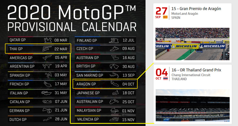 受到新型肺炎疫症影響,所有比賽都要延期舉辦或停辦,雖然MotoGP的Moto2及Moto3如期在卡塔爾舉行(3月6-8日),不過MotoGP組別被取消,使揭幕戰大為失色,而原定在3月20-22日舉行的第二回合泰國站,也因為疫情押後至10月2-4日舉行。事實上,這個檔期原本屬於西班牙阿拉崗站,但由於得到阿拉崗政府讓路,將比賽提前至9月25-27日進行,才得以讓泰國站延遲上演。