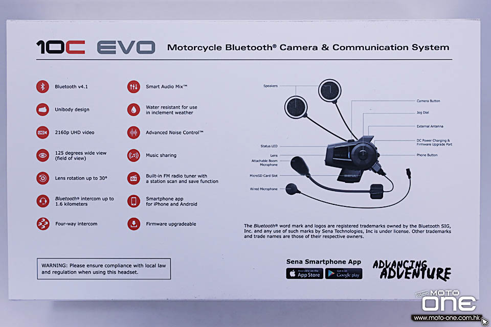 SENA 10C EVO 4K超高清攝影機結合藍牙通訊系統│美國頂級藍牙品牌│安定車行 於2016年,SENA 美國頂級藍牙品牌推出了10C,是市面上首次出現結合攝影機的藍牙通訊系統,藉著整合了Sena具有全球藍牙領導地位與創新的耳機及攝影機技術而成為一強大的組合。Sena 10C的設計在不同業界裡帶來了革命性的設計 - 從各項戶外活動、電單車運動,引領市場的地位。