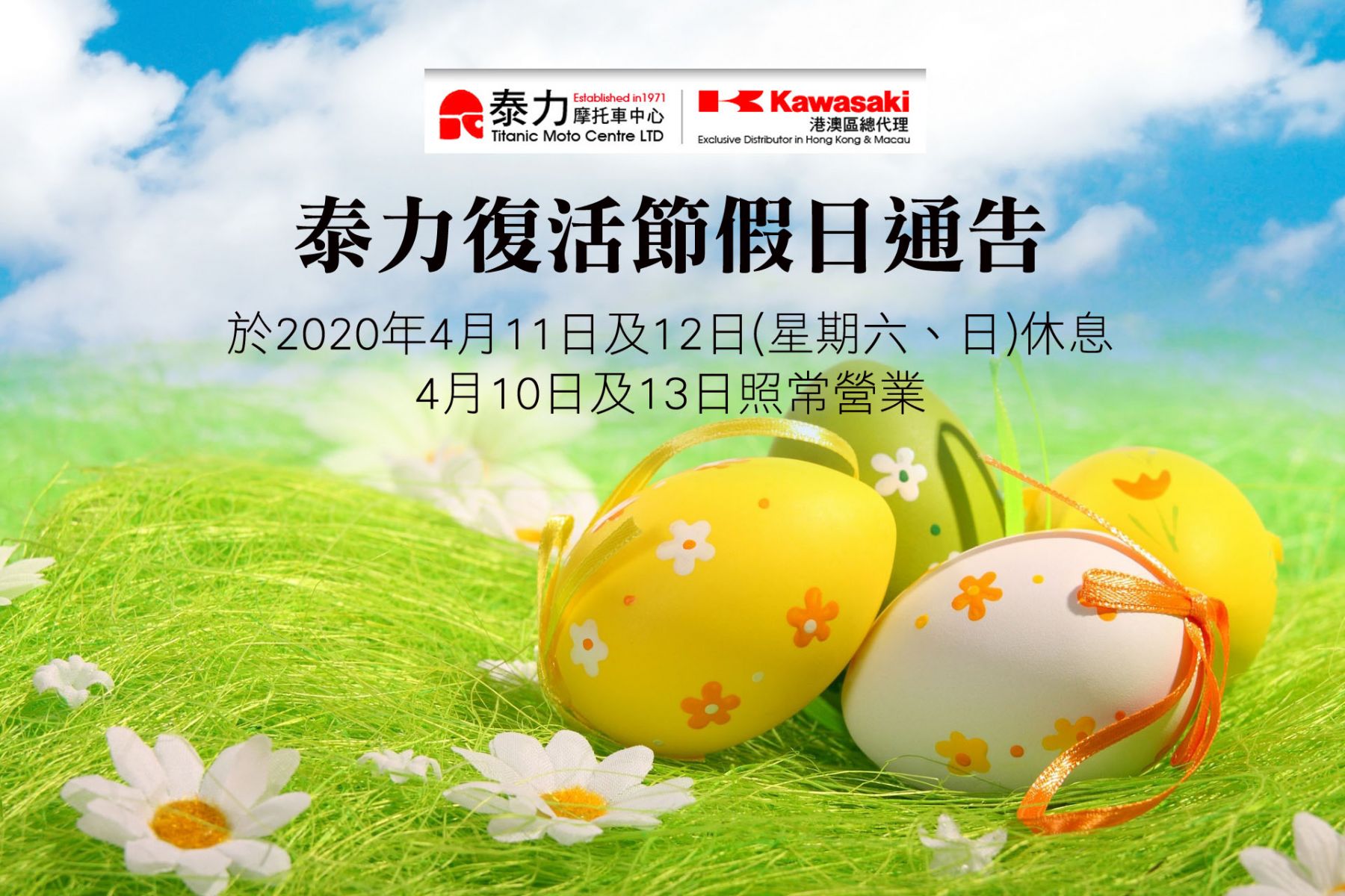 泰力復活節假日通告 於2020年4月11日及12日(星期六、日)休息 4月10日及13日照常營業