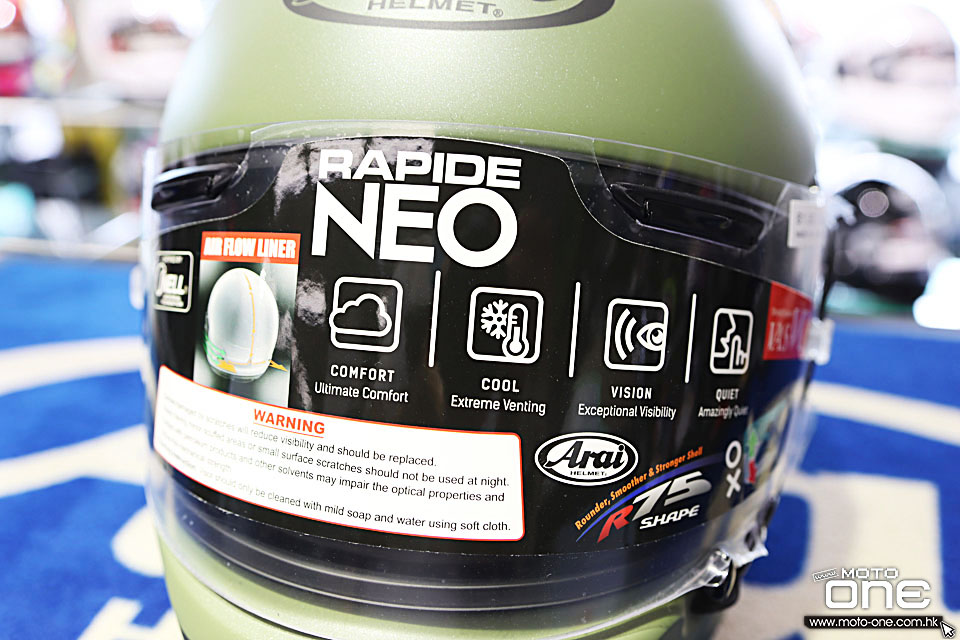 ARAI RAPIDE-NEO ROARS & OVERLAND〈2020設計師系列〉復古與個性兼備的全面頭盔 - 鴻興發售 ARAI RAPIDE-NEO延續了RAPIDE-IR的貓鬚下巴進氣口,配以圓弧外殼以及VAS鏡片系統,捨棄了常見的前額進氣孔,讓圓滑的頭盔更加安全。ARAI為了確保RAPIDE-NEO的通風效果,首次在頭盔內部的减震EPS泡沫加入導風嘈 。RAPIDE-NEO具有復古元素並且有着更鮮明的年代感,圓弧造型與突出下巴進氣有着十足的80年代風格,適合騎復古車又不想在安全上妥協的您。今次,最新抵港是ARAI RAPIDE-NEO ROARS & OVERLAND〈2020設計師系列〉,專屬拉花設計更添個性。