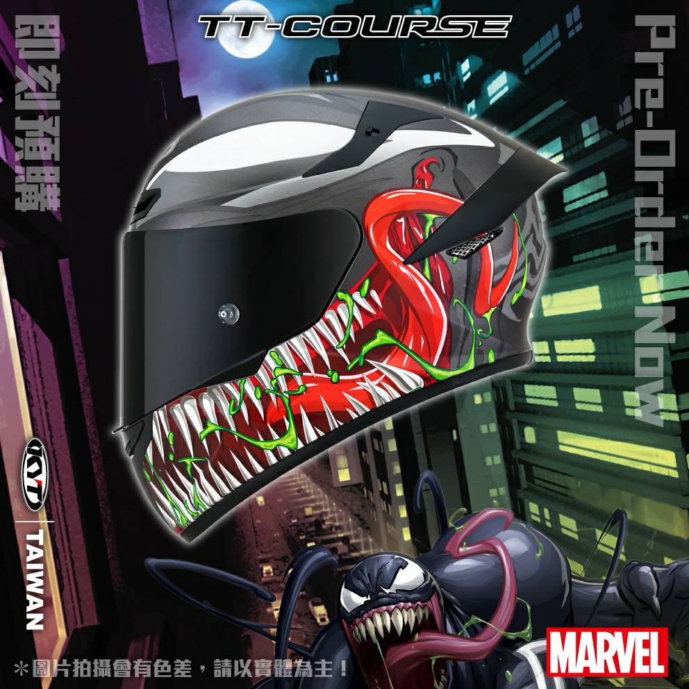 〔KYT X MARVEL限定CROSSOVER!〕 Marvel Venom 毒魔及 CARNAGE 血蜘蛛,是由暗黑版蜘蛛俠機基因變種而來!雖然外型有蜘蛛俠風格,但卻是邪惡的反派角色。但KYT和MARVEL Crossover的這款頭盔造型,是來自蜘蛛俠漫畫中被外星寄生體依附的故事(也就是電影蜘蛛俠3的劇情),同樣有血盤大口,同樣給你兇猛的騎乘外型!