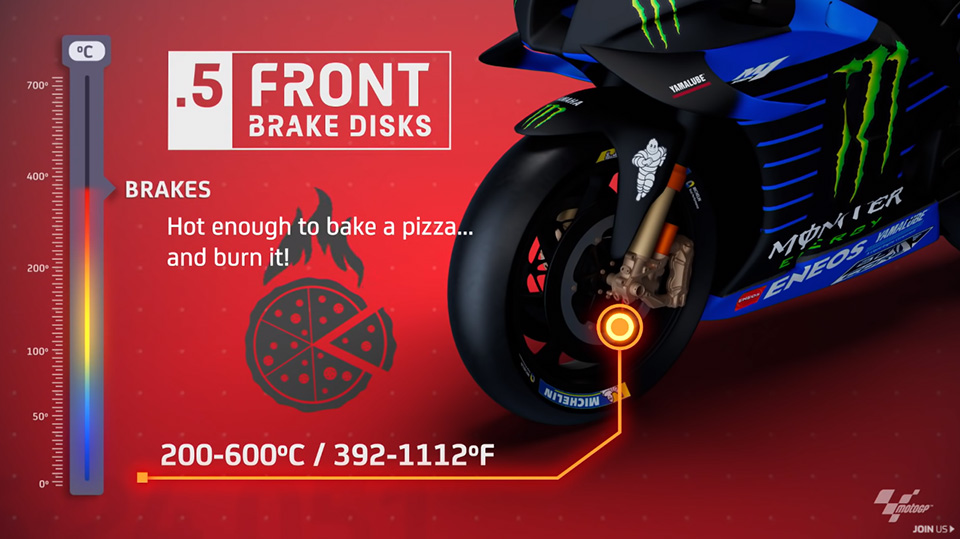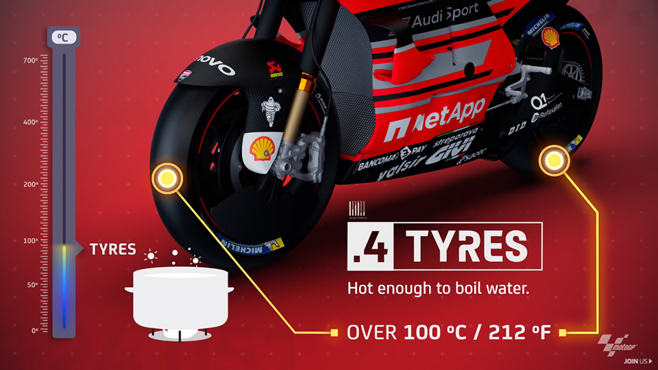 引擎的燃燒室是電單車最熱部位,MotoGP戰車都不例外,燃燒汽油後產生的溫度比穿梭機返航的溫度更高,超過攝氏1800度°C,輪胎更達到可以煲水的溫度。而MotoGP官方最近製作短片,告訴車迷戰車各部位的溫度,相當有趣。回想2012年澳門格蘭披治大賽,本誌使用熱能探測鎗,在賽後量度戰車及車手溫度,結果發現尾胎即使停止行駛2分鐘,仍然高達99.5度°C。