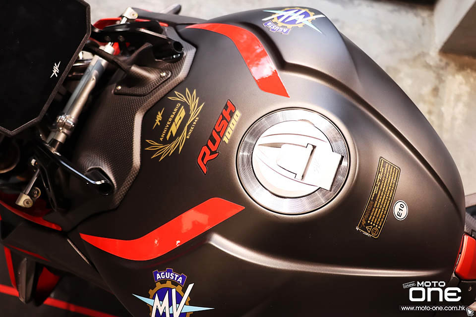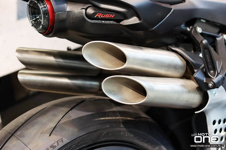 不難發現,MV AGUSTA Rush 1000全身名牌,然而MV AGUSTA的傑作從不會出現「大媽」式堆砌。車子採用Ohlins電子前叉及Ohlins電子單筒尾避震,還有Ohlins電子釘把 (防甩頭)。前掣動為頂級Brembo Stylema 4活塞煞車卡鉗配320mm煞車碟,鈦合金人手製造的排氣管由SC-PROJECT度身訂造,精美輪框由意大利Kineo設計,全彩液晶儀錶也是不可或缺。LED大燈則來自同廠的RVS#1,會根據車頭轉向變更照明角度,可提升騎士夜間行駛安全。