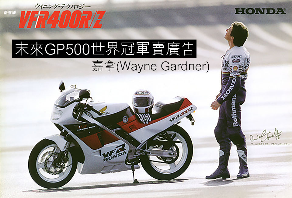 1986年VFR400R面世,廠方請來當時的澳洲GP500巨星—嘉拿(Wayne Gardner)拍廣告,他當年駕駛第一代RVF 750廠車,替HONDA HRC廠隊奪得1985及1986日本鈴鹿八耐冠軍。1987年,嘉拿(Wayne Gardner)憑著2衝HONDA NSR500戰馬,奪得GP500世界冠軍。其實嘉拿初出道的時候,曾經出戰1982年澳門格蘭披治大賽,他當年駕駛HONDA RSC1100參賽,不幸炒車受傷退出比賽。