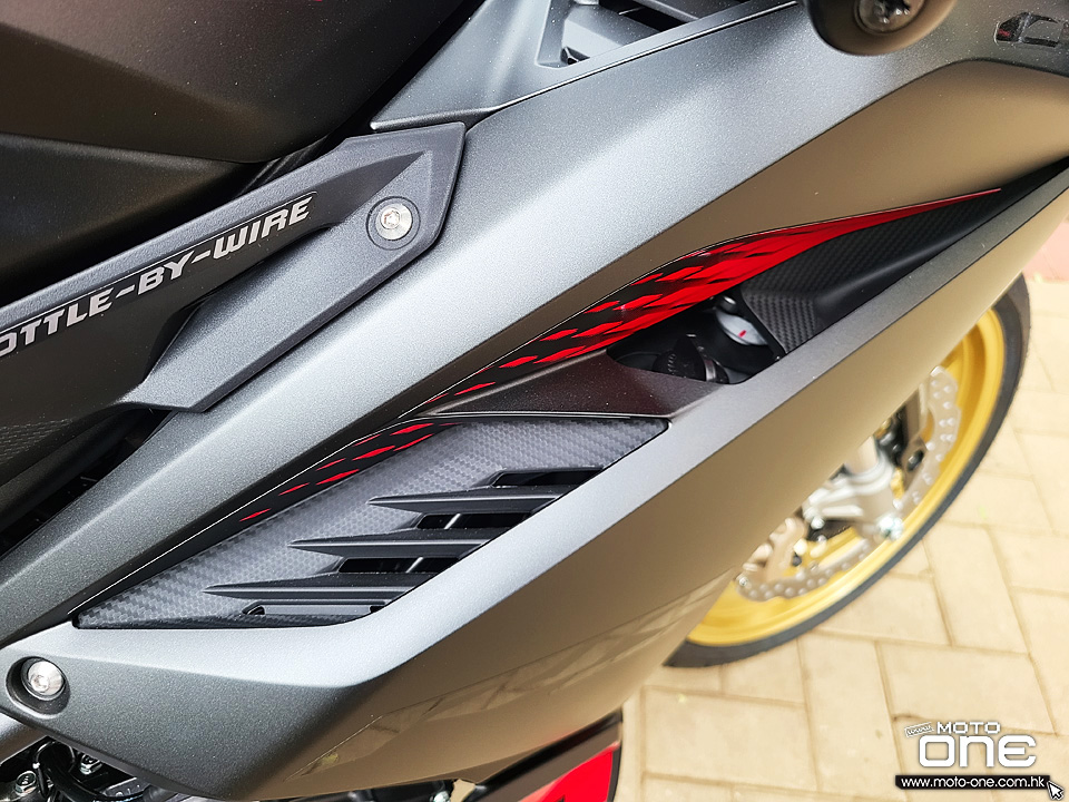 外觀上2021新版本HONDA CBR250RR改用為前後金色輪框,較舊款黑色輪框為搶眼。