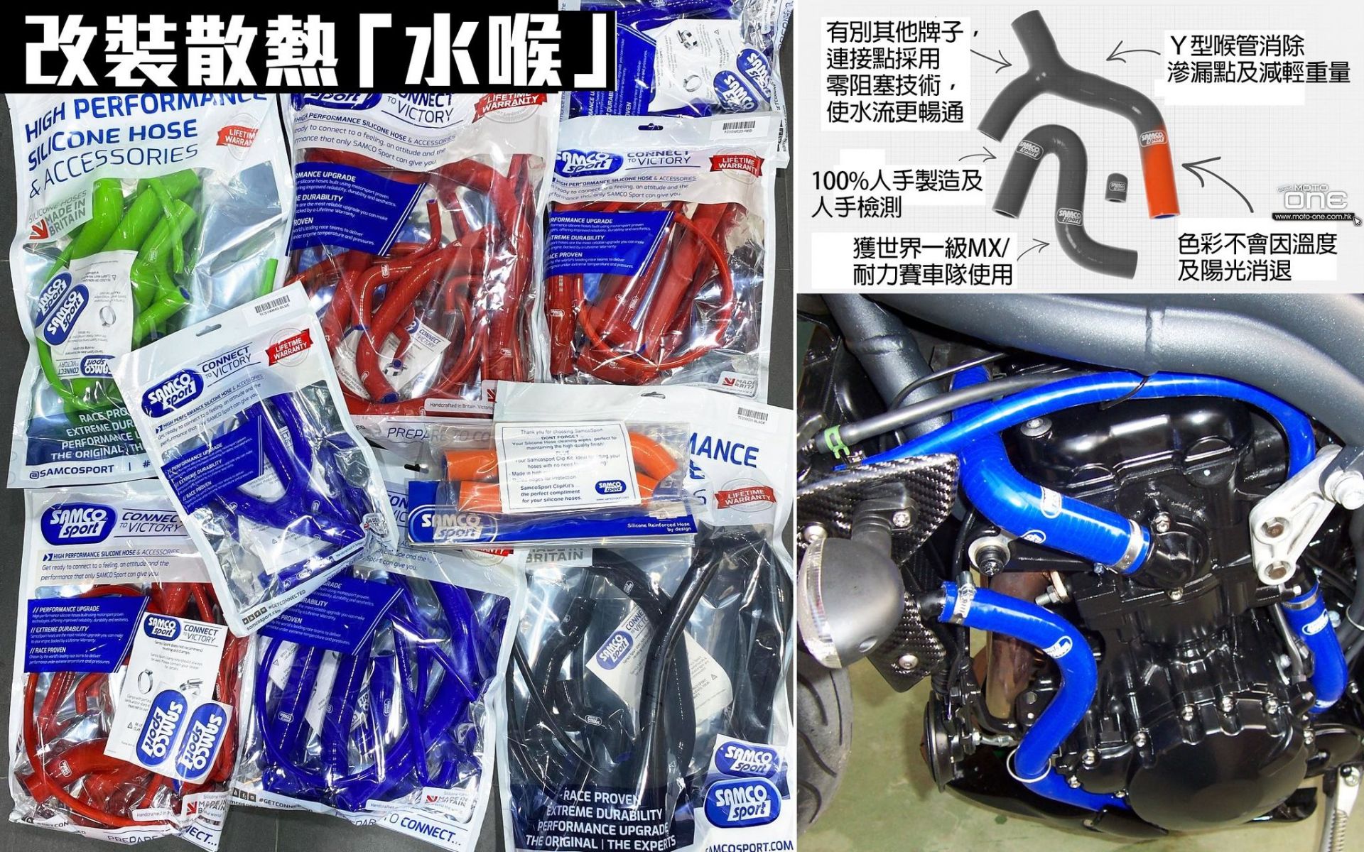 由於經過改裝的電單車,特別是賽道上的戰車會有更高溫度,騎士除了可能會更換更大容積散熱水箱之外,都會更換能夠抵受更高壓力的「水喉」,以確保水冷散熱在嚴苛環境下運作正常。即使好多玩原裝車的車主,都會因為喜歡改裝水喉的顏色而換喉,而英國製的SAMCO「水喉」就是其中一款最多騎士及車隊使用的喉管;最近,MOTARD TECH又再引入色彩繽紛SAMCO「水喉」,包括KAWASAKI綠、KTM燈、YAMAHA藍及HONDA紅,如果你嫌原裝黑管沉悶,都可以考慮變色。