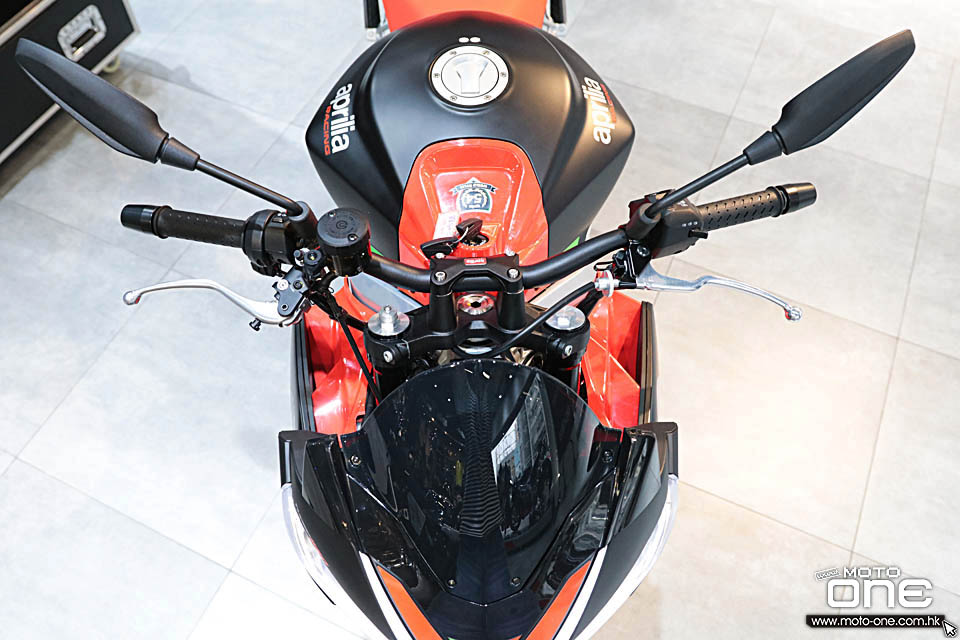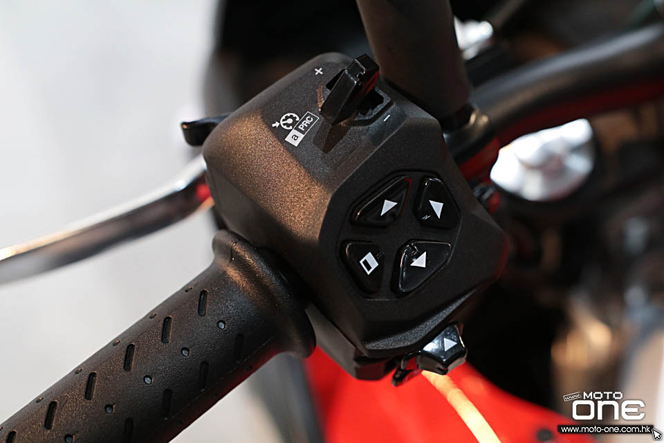 ATC: Aprilia Traction Control可調式循跡控制系統(防尾輪打滑) AWC: Aprilia Wheelie Control加速防起頭控制 ACC: Aprilia Cruise Control 定速巡航 AQS: Aprilia Quick Shift快速電子轉檔,包括升檔及拖波不用扣離合器桿。 AEB: Aprilia Engine Brak引擎煞車,調校縮油後引擎煞車造成的頓挫感。 AEM: Aprilia Engine Map駕駛模式,三個街用馬力模式分別是Commute(日常通勤)、Dynamic(運動模式)及Individual(自行設定),另外兩個供賽道使用,分別是Challenge(挑戰)及Time Attack(計時)。 彎道式ABS提供三段調校。