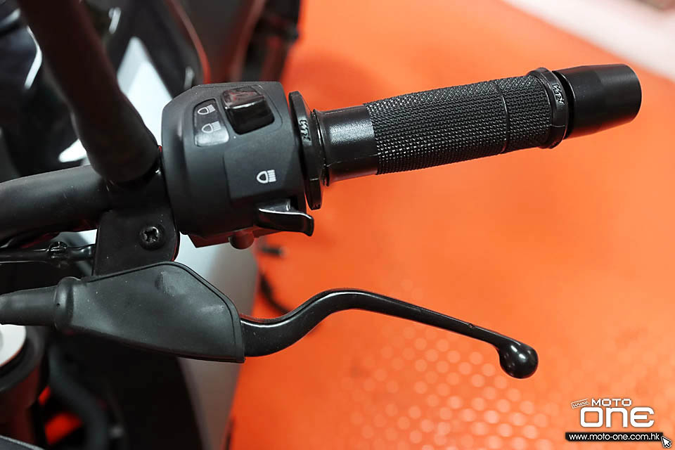 基於市場消化考慮,她只採用實用型單色液晶儀表,而非其他大 DUKE 的全彩TFT屏幕,左右把手掣組具有背景光,在暗夜時使用更方便,盾形大燈兩旁設有定位燈,實用性再加分。