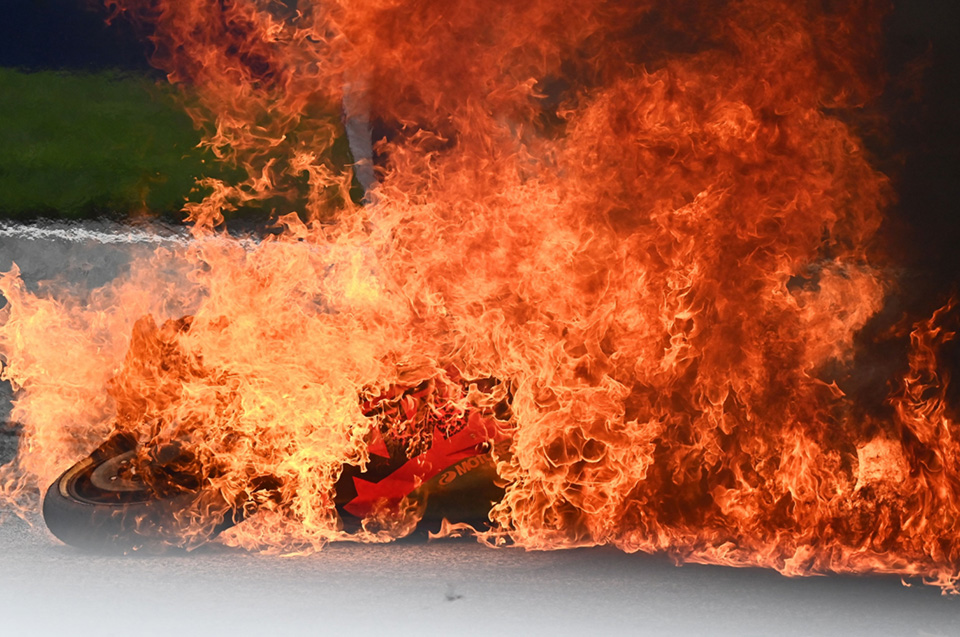 APRILIA戰車爆油缸後率先著火,汽油波及KTM戰車。