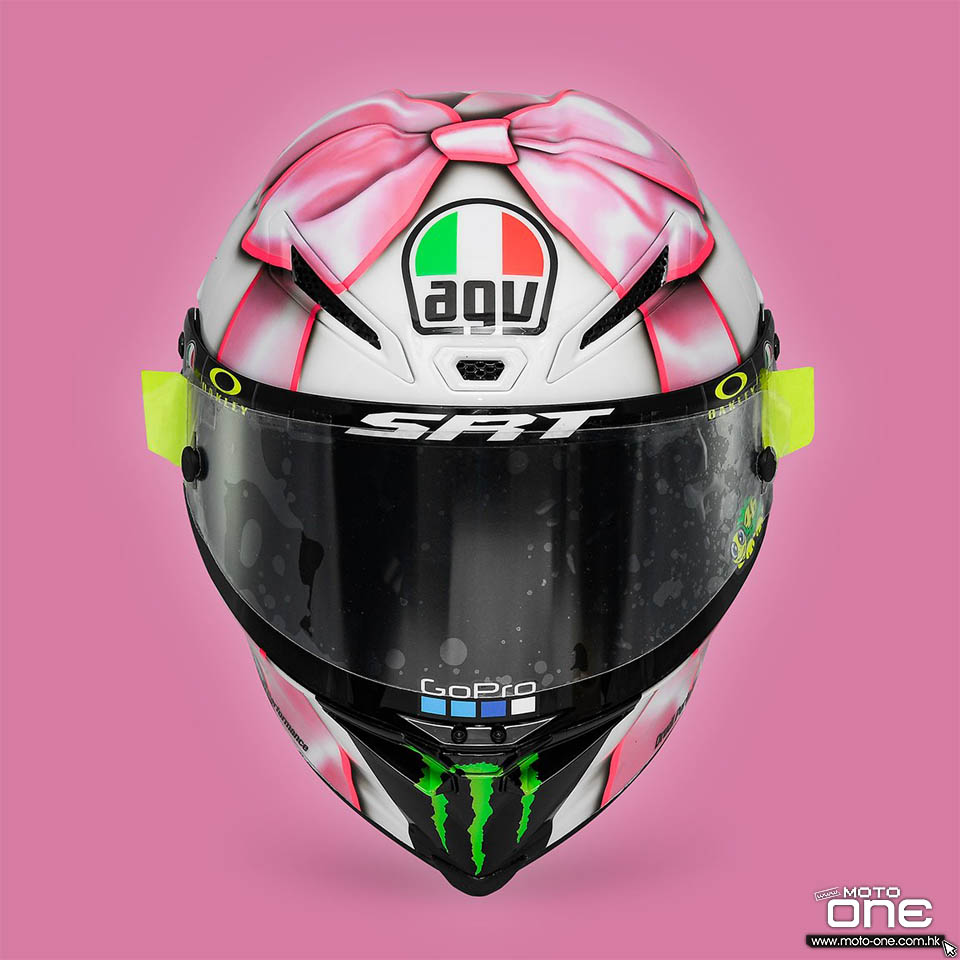 AGV PISTA GP RR VALENTINO MISANO 2021 - MOTOGP意大利聖瑪利諾站羅絲的粉紅禮物花帶頭盔 已經宣佈完成2021年MOTOGP賽事後將會正式引退的羅絲,這次應是他以車手身份最後一個推出的MISANO意大利聖瑪利諾站主場頭盔,極具紀念意義。
