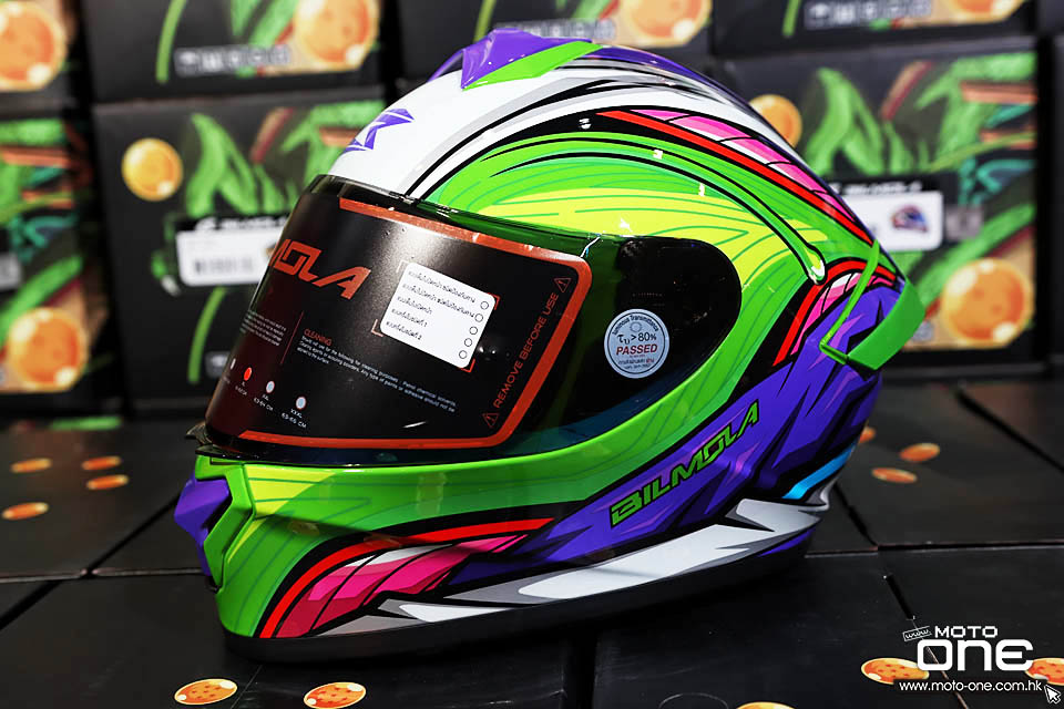 『Bilmola X 龍珠Z特別版頭盔』以全面頭盔推出,外殼採用防震熱塑性(SRT)材料,全盔重量僅1,600±50g,通過泰國TIS和歐盟ECE安全規格標準。頭盔內置實用太陽鏡片、Double DD ring 雙D環扣帶、可全拆內綿清洗、支持磨砂Pinlock30防霞鏡子安裝、支持藍牙安裝等等。