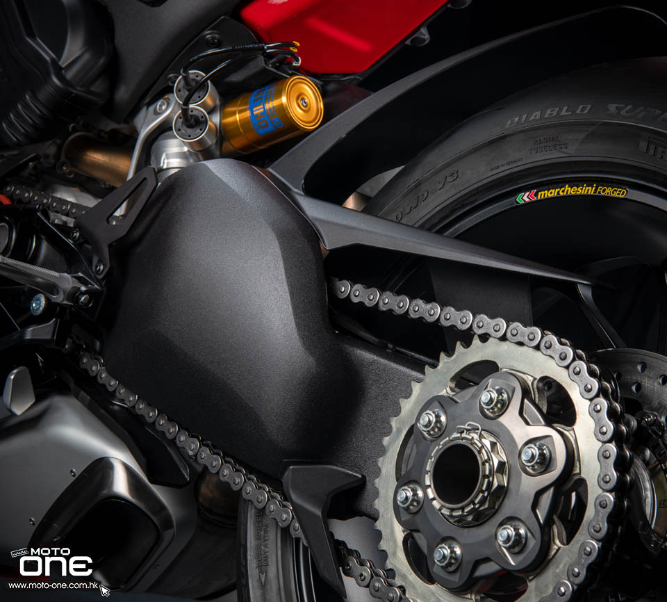 除此之外,廠方利用WSBK廠車的數據 (DUCATI使用PANIGALE V4R出戰WSBK世界賽),修改變速箱(波箱)的齒輪比率,分別將1檔延長11.6%、2檔延長5.6%,俗稱更長氣,雖然犧性了瞬間極速爆發力,速度上升稍稍降低,但該引擎本身已具有強勁的加速性能,因此對好多騎士來說影響不大;相反,更長氣的齒輪比反而使扭力最強勁的1檔、2檔變得相對溫馴,換句話騎士在賽道上使用1檔或2檔攻入或駛出慢速的S彎,或者連綿彎道,縮油減速及開油加速將會更容易掌握,冇咁Choke,據廠方表示快速電子轉檔器都獲得改良,升檔及退檔比舊款更流暢,再者尾搖臂樞軸升高4mm,車身在退檔及加速後的窒動感都會減少。