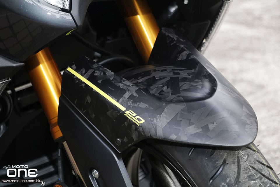 鍛造碳纖維前沙板有20週年圖案及黃線配搭。