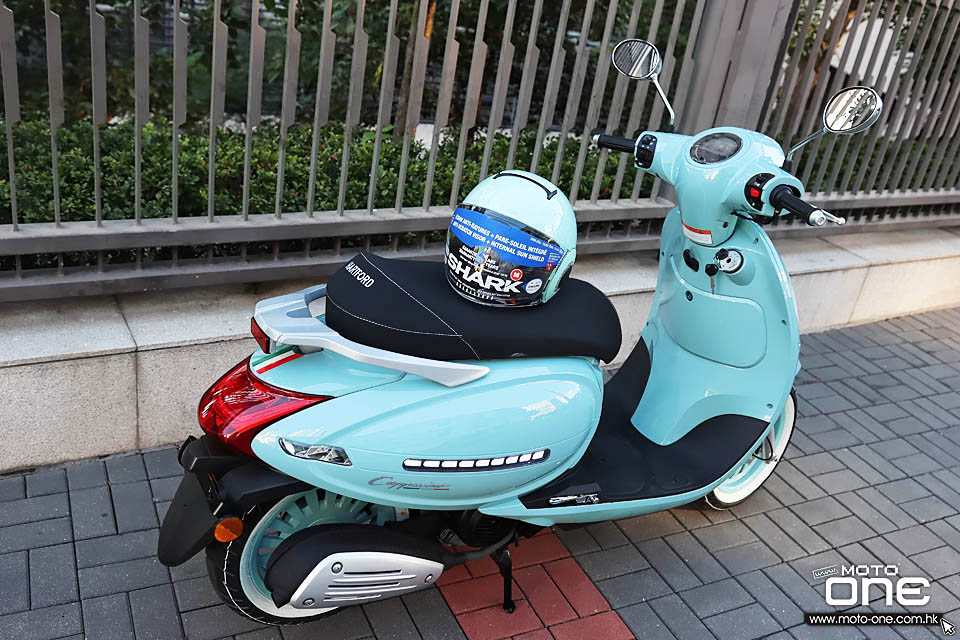 CAPPUCCINO 150 ABS有鮮紅、黑色及今次拍攝的水湖藍三色,如同鮮艷、沉實與清新的個性分別。採用全台灣製造的150c.c.風冷四衝程單缸SOHC 4氣門引擎,最大馬力 9.13ps/9,000rpm及最大扭力0.83kg-m/7,000rpm,可上高速,適合入門新車及代步用家的選擇。加上前碟煞附有ABS防鎖死煞車系統、耗油量約 45km/1L及HK$23,800相宜的定價,絕對是平價低玩之選。