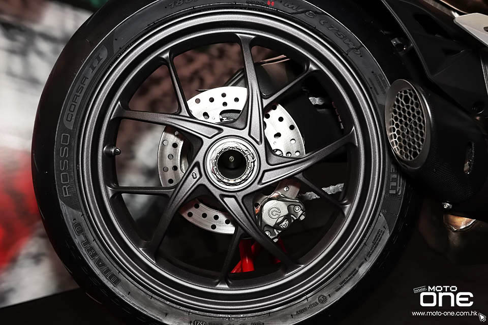 955c.c.水冷四衝程90度V型Desmodromic雙汽缸8氣閥Superquadro機器,最大馬力155hp/10,750rpm,最大扭力104 Nm/9,000rpm。
