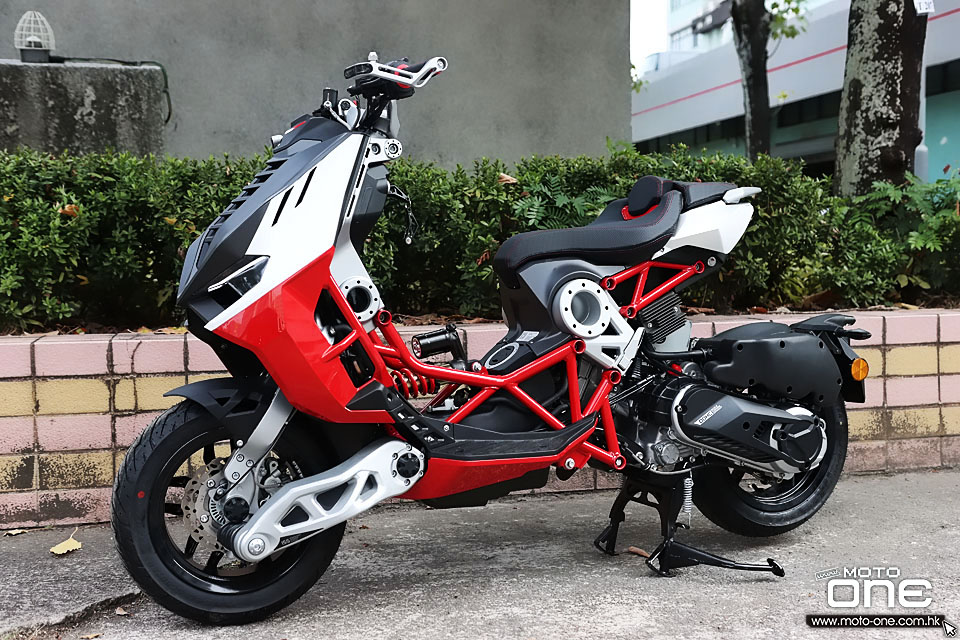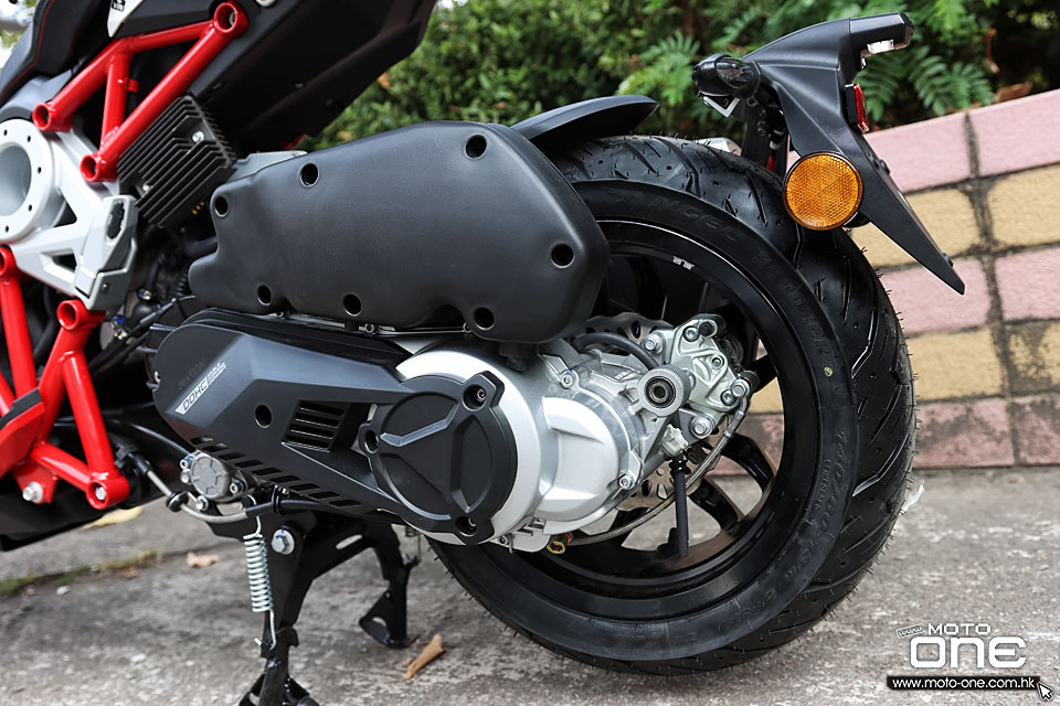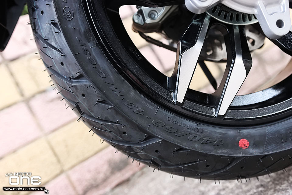 另外,配備橫置式尾避震(預載可調),前200mm、後190mm浪花煞車碟及BREMBO前後掣動卡鉗,附ABS防鎖死煞車系統,掣動設定誠意十足。前120/70-12吋、後140/60-13吋 Pirelli 天使綿羊輪胎,具備良好抓地性能。