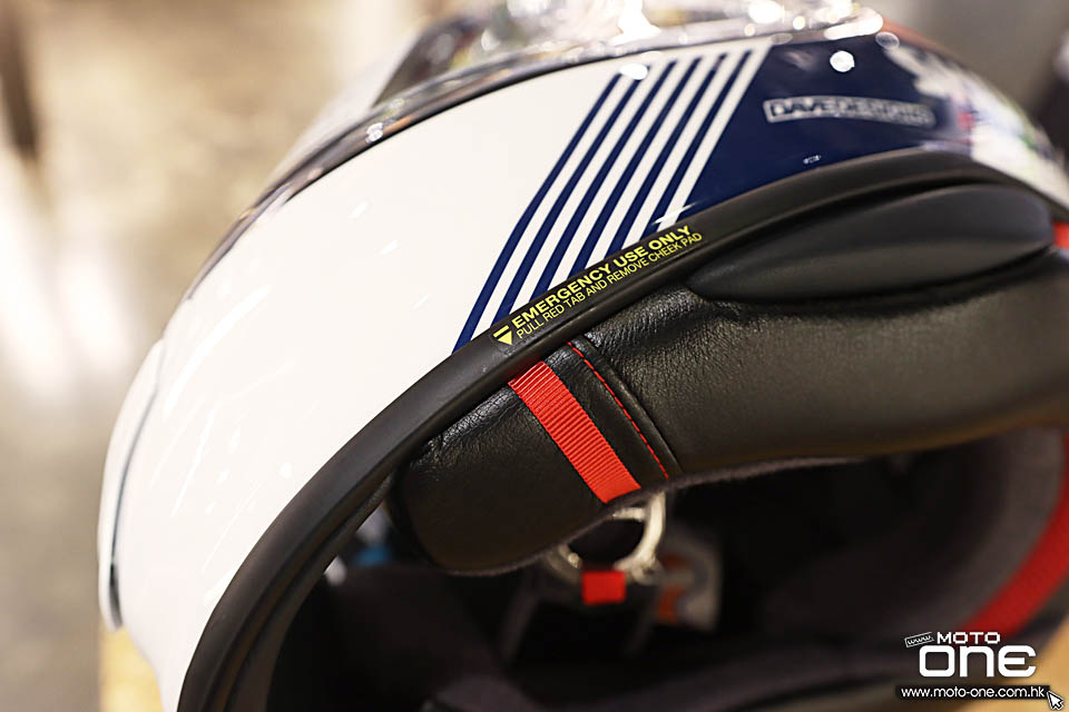 這款Marc Marquez復古彩繪以充滿競技感嘅白、紅、藍作為主色,色塊形狀簡約卻動感十足,設計概念是向0至80年代的傳奇車手致敬。並配上沒有六角形外框的SHOEI商標與圓潤字體,讓70、80年代SHOEI風格要素在頭盔上忠實呈現。