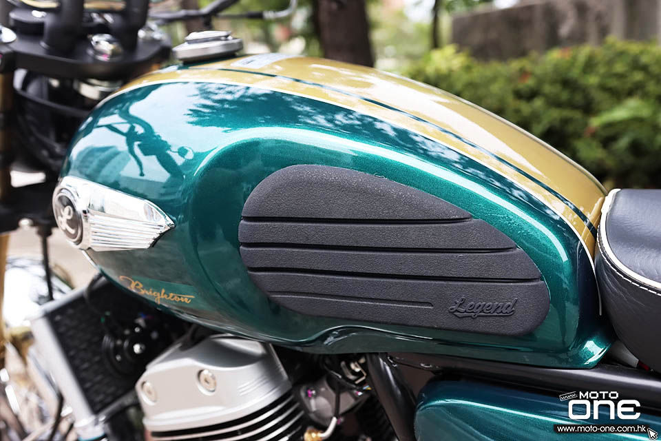 比對標準版的 LEGEND 250 Twin 採用CAFE RACER的杯士軑,需要較俯伏的騎姿,而新款LEGEND 250 Brighton側改用街車的高軑把,座姿更舒適的設定。至於234c.c.油冷四衝程雙汽缸DOHC 8氣門引擎、前後煞車碟、前後LED燈及LED指揮燈等等裝備,與標準版LEGEND 250 Twin相同。