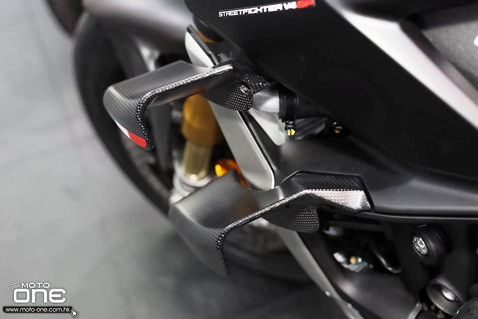 Streetfighter是一款充滿肌肉感的街頭戰士,造型極度兇悍,而SP以黑色為主調,配以DUCATI紅線,將油缸與座墊從車身分隔,加上金黃色的Ohlins避震作點綴,配以造型宏偉的銀色水冷及油冷散熱器,以及銀色排氣管,配色正好與拉絲紋的鋁合金油缸互相輝映,使全車的肌肉感表露無遺,只有SP版才擁有這紋路的油缸外殼。精美座墊還繡上V4 SP的Logo,夠晒精緻。