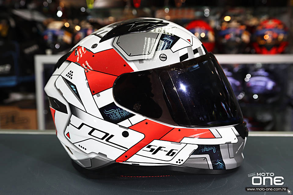 SOL SF-6 機動裝甲拉花全面頭盔 SOL SF-6 機動裝甲系列屬2022年最新全盔系列之一,擁有絕對優勢,內置太陽鏡及藍牙耳機位,內棉亦採用奈米竹炭與COOLMAX材質,保持涼爽!