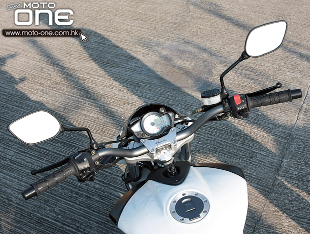 ![]() 即使筆者沒有駕駛125版本的經驗,250的馬力怎會比125差呢!很明顯,這兩台「車仔」又是專為平民玩家而設。09年第一次看見「啡呤」版時便覺得也是歐日戰車的混合體,車頭帶點Honda CBR 600RR影子,體架則採用歐洲車喜用的鋼管車架,車尾則使用尾排設計,非常有趣。由於筆者並非跑車迷,固此先試駕250街車版,由於車輛採用單汽缸引擎,車身體積不但纖巧,座高同樣低矮,幸好並沒有跟隨時下流行的街車跑車化座姿,固此可以挺直胸膛開車,整體座姿非常「就手」,又是一台讓筆者在毫無壓力下玩樂的小車。