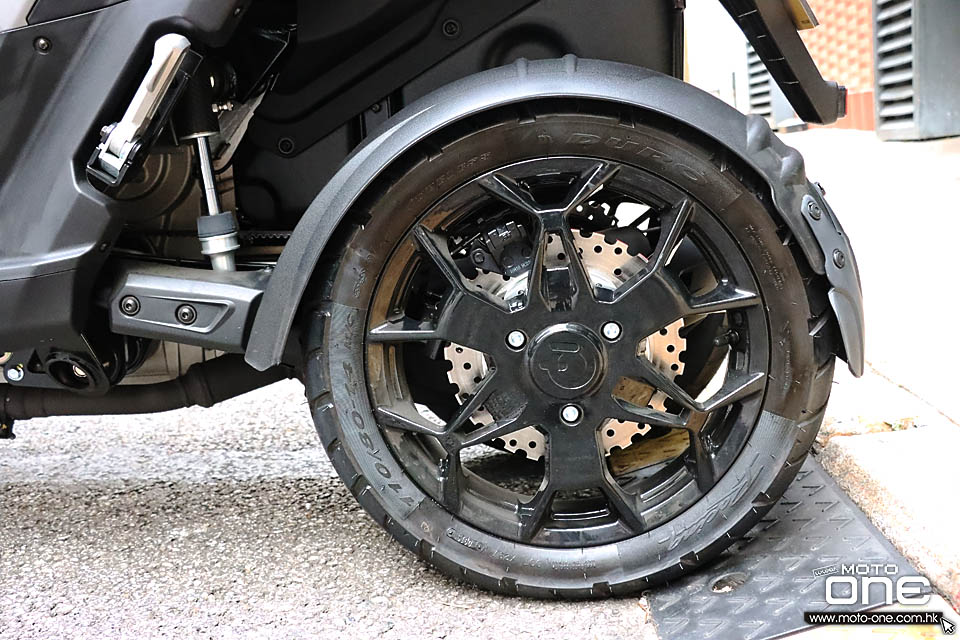 前後輪胎四條同樣是110/80-14吋,而每條車輪均採用相對的240mm煞車碟配煞車卡鉗。