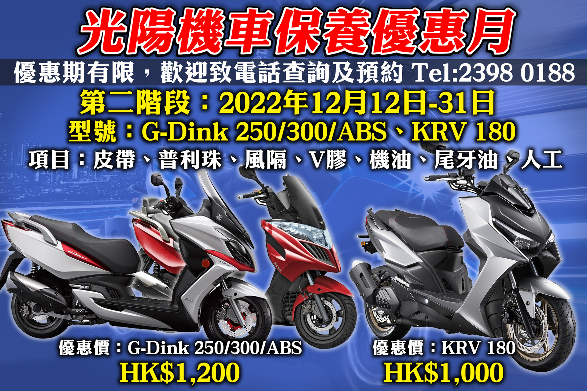 光陽機車保養優惠月 優惠期有限,歡迎致電話詢及預約 Tel:2398 0188