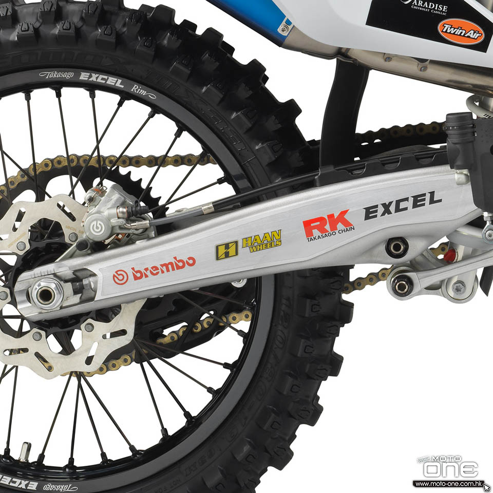黑色陽極氣化的EXCEL Takasago 優質鋼線前後輪框,不僅非常堅固,而且重量減輕也有助 FC 450 Rockstar Edition 的整體操控性。還有經CNC電腦切割的上下眼鏡、重量輕巧且非常堅固的ProTaper專業車把、Dunlop GEOMAX MX33 越野電單車輪胎,全部均為Husqvarna Factory Racing 賽車組件。