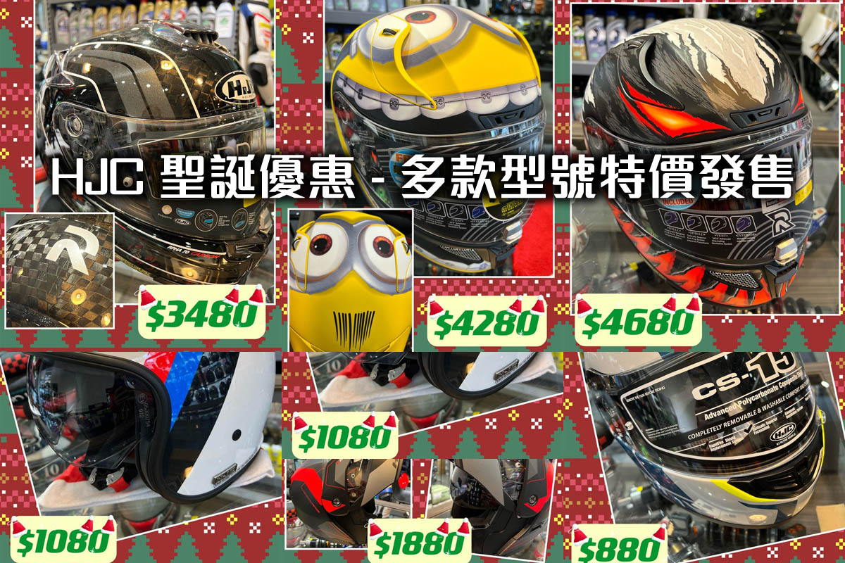 HJC 聖誕優惠 - 多款型號特價發售(三禾) 今次HJC 聖誕優惠包括:RPHA 11高階賽車頭盔、RPHA 70 大格仔Carbon紋實用高階全面頭盔、V90 Vintage風格全罩頭盔、C80 全新多用途頭盔、I70 中階全面頭盔、V30 復古風極簡頭盔、CS-15 入門全面頭盔等,優惠款式全面﹐襯聖誕特價獎勵下自己今年既努力吧!