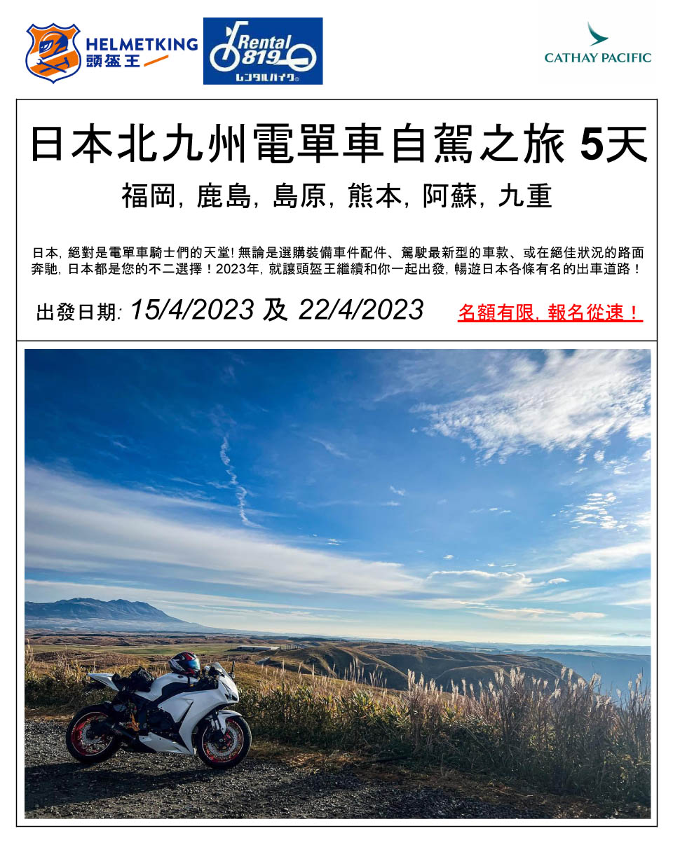 現在剛發佈了「第二團日本北九州電單車自駕之旅5天」,分別有15/4/2023 及 22/4/2023 兩團,行程安排途經福岡、鹿島、島原、熊本、阿蘇、九重等地方,提供專業領航員及載行李的支援車,參與者無需花時間與心思安排行程及項目,就可享受觀光各地的美景,享受日本道路駕駛的體驗與樂趣。