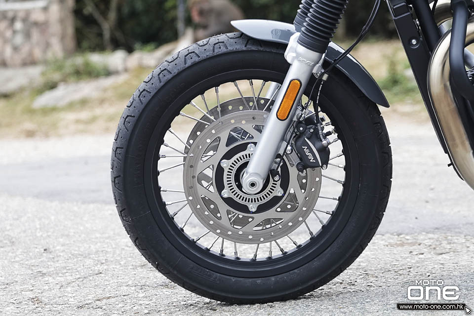 前採用18吋、後17吋鋼絲輪框,前大後小的輪框,於復古車是常見設定,雖然鋼絲在打理方面需要花較多的時間,但可以提升復古外觀元素,是值得的。前配置一對NISSIN兩活塞卡鉗配310mm煞車碟,後用了NISSIN一隻雙活塞卡鉗配260mm煞車碟,煞車力相當強。