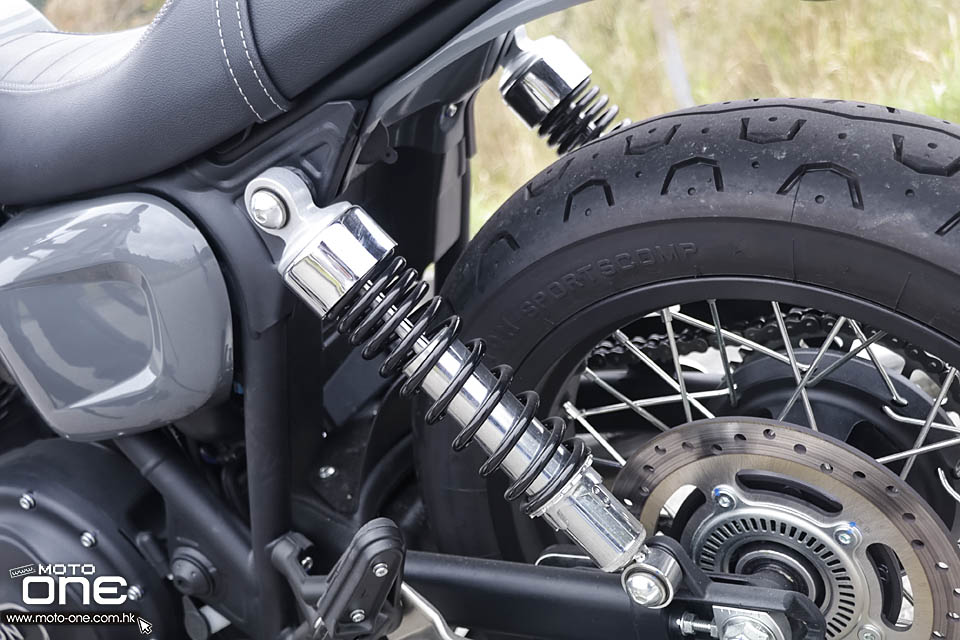 車子前後均選用KYB避震,前直徑41MM正立前叉,不設調校,套用了懷舊風格風琴式防塵套,增力復古的味道,而後方採用了雙筒尾避震,提供預載調校。