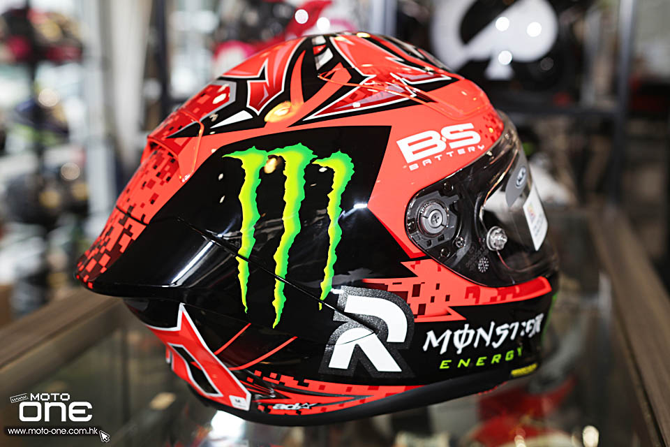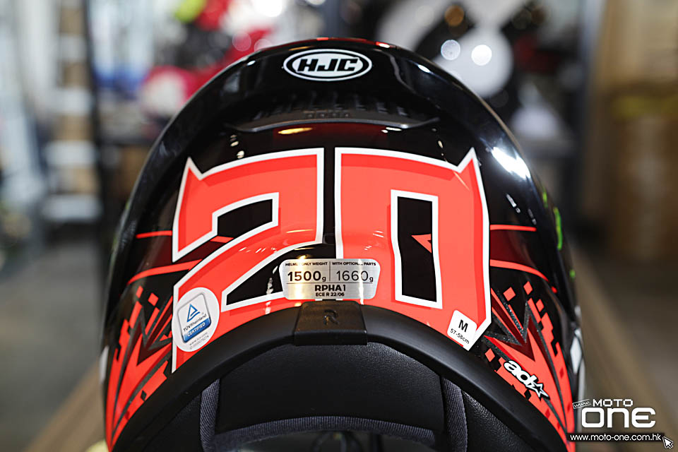 HJC RPHA 1頭盔附過透明尾翼擾流板、防霞鏡子及比賽專用的TEAR-OFF FILM鏡面撕膜(比賽時因高速令昆蟲打擊在頭盔面鏡上,貼上TEAR-OFF FILM鏡面撕膜,可以快速撕走貼在膜上的昆蟲,快速回覆清晰視野。